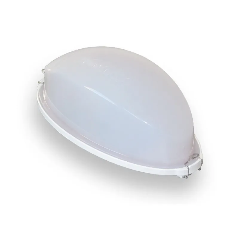 Mleczny kolor szkła. Lampa wykonana z plastiku, bez uszczelek między obudową, a szkłem.