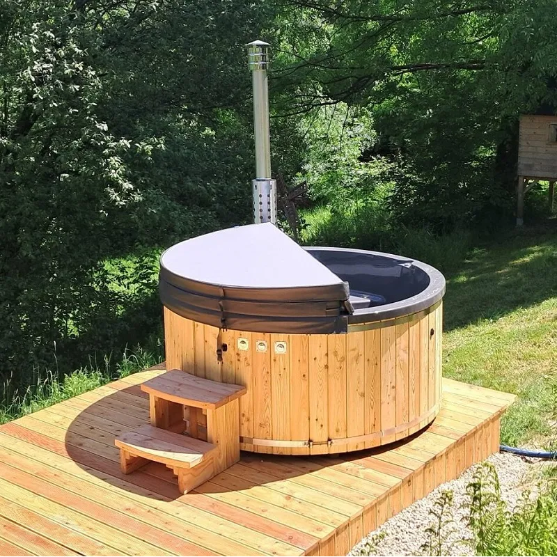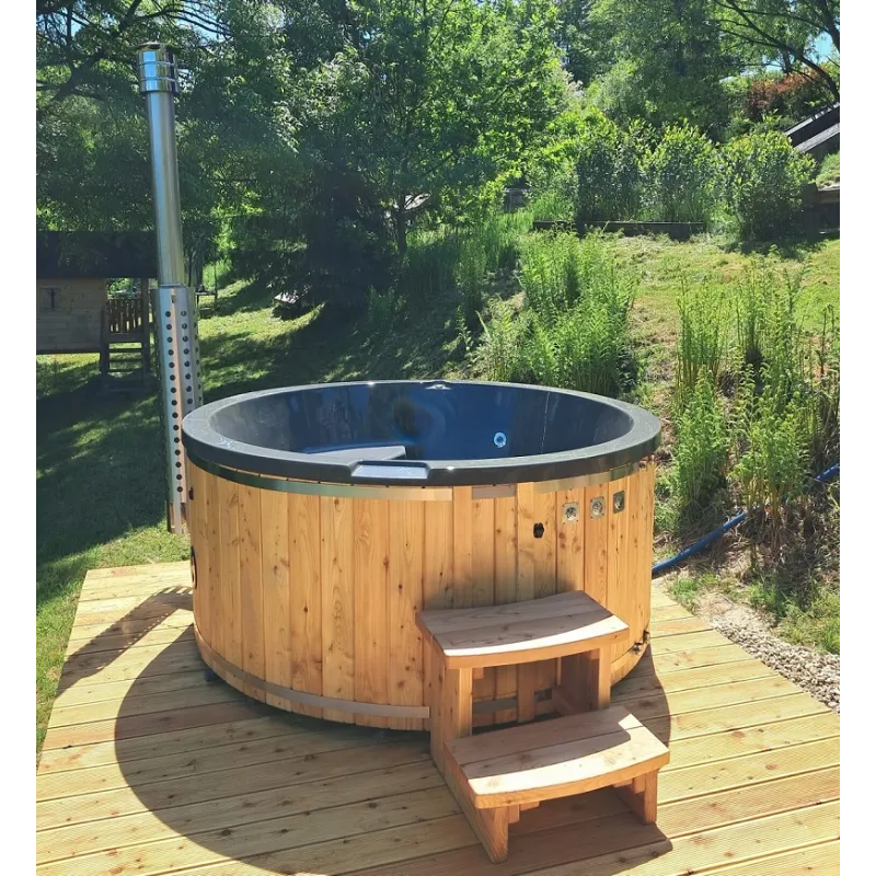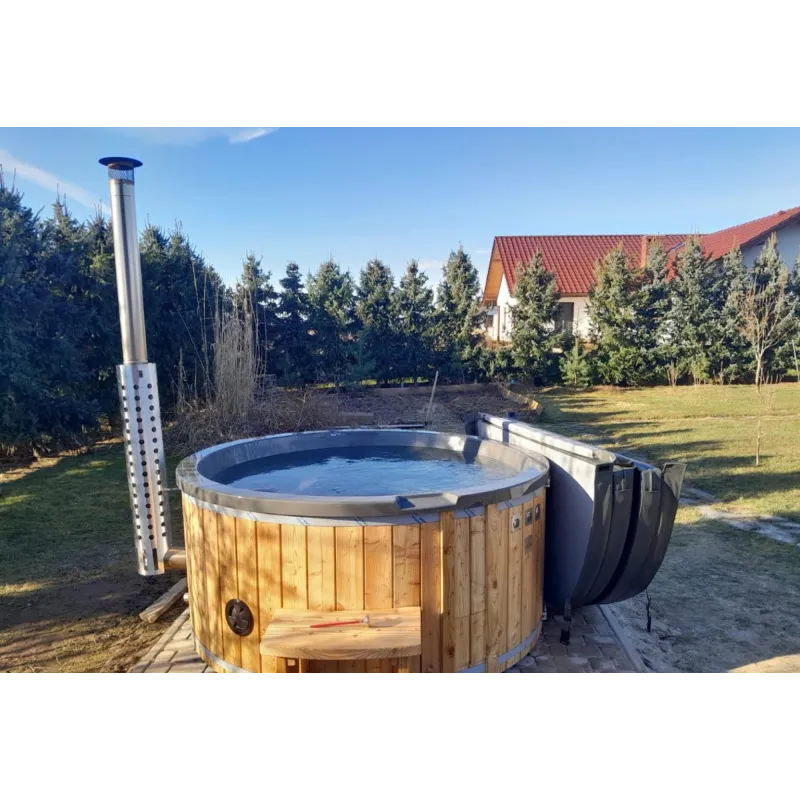 Drewniane schodki ułatwiają wchodzenie i wychodzenie z balii, zapewniając dodatkowy komfort i bezpieczeństwo.