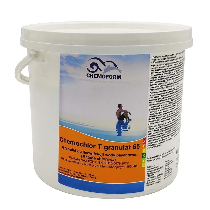 Chemochlor T Granulat 65 to silny preparat chlorowy w postaci szybko rozpuszczalnego granulatu do stałej i szokowej dezynfekcji wody basenowej. Ok 56 % chloru.