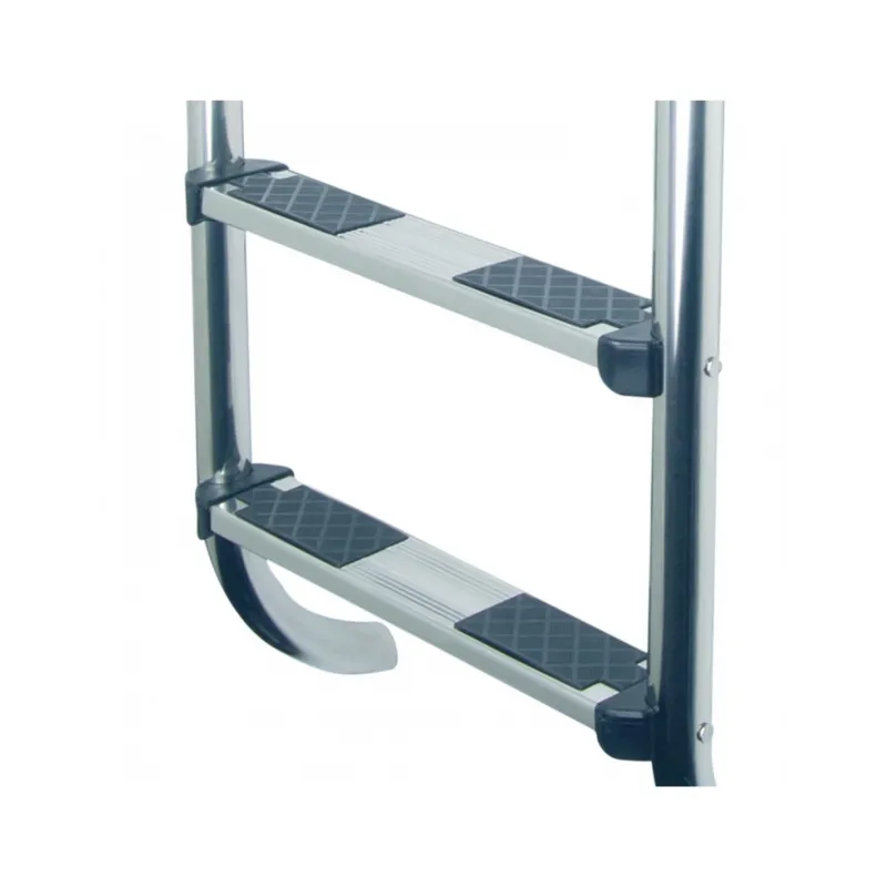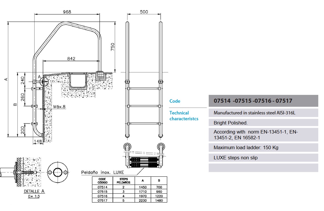 Szerokość drabiny 500 mm z poręczami Ø 43 z polerowanej stali nierdzewnej AISI-316. W komplecie z kotwami mocującymi. Drabinka posiada górny podwójny stopień bezpieczeństwa zgodnie z art z EN 13451-1, EN-13451-2 i EN-1658-1. Antypoślizgowe stopnie LUXE ze stali nierdzewnej AISI-316.