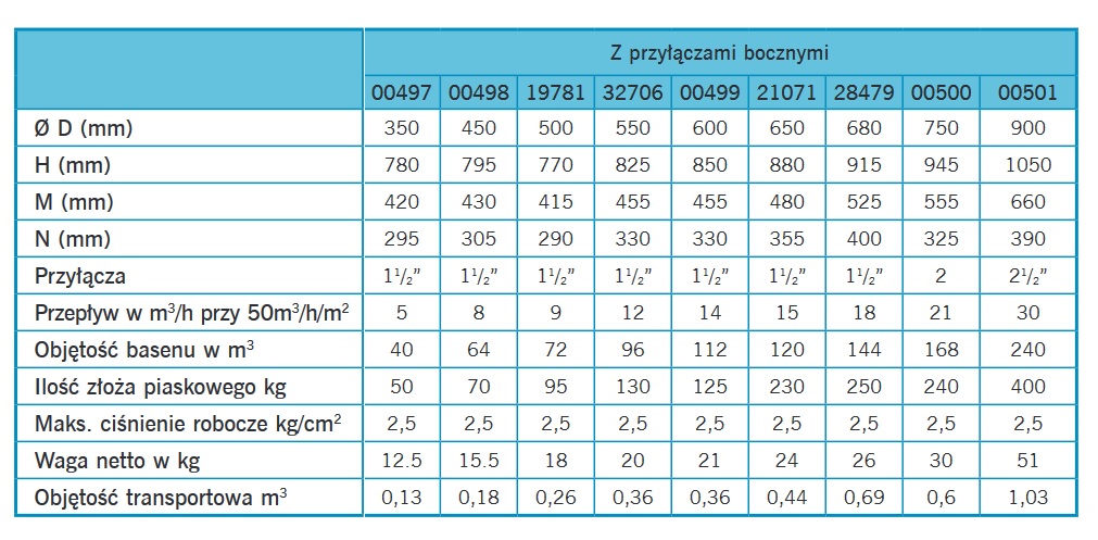 Filtry basenowe Aster z przyłączami bocznymi są dostępne w średnicach od 350 mm do 900 mm i są odpowiednie do basenów o objętości od 30 m3 do 240 m3. Filtry Aster występują też w wersji z zaworem górnym.
