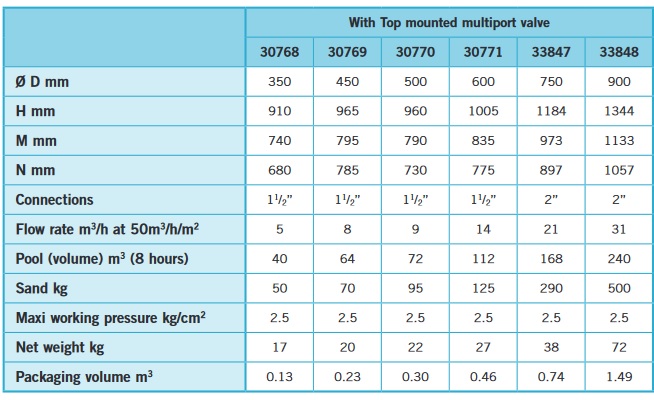 Filtry basenowe Aster z zaworami górnymi są dostępne w średnicach od 350 mm do 900 mm i są odpowiednie do basenów o objętości od 30 m3 do 240 m3. Filtry Aster występują też w wersji z bocznym górnym.