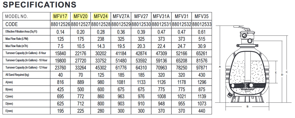 Filtry basenowe FLOTIDE MFV17 z zaworami górnymi są dostępne w średnicach od 425 mm do 775 mm