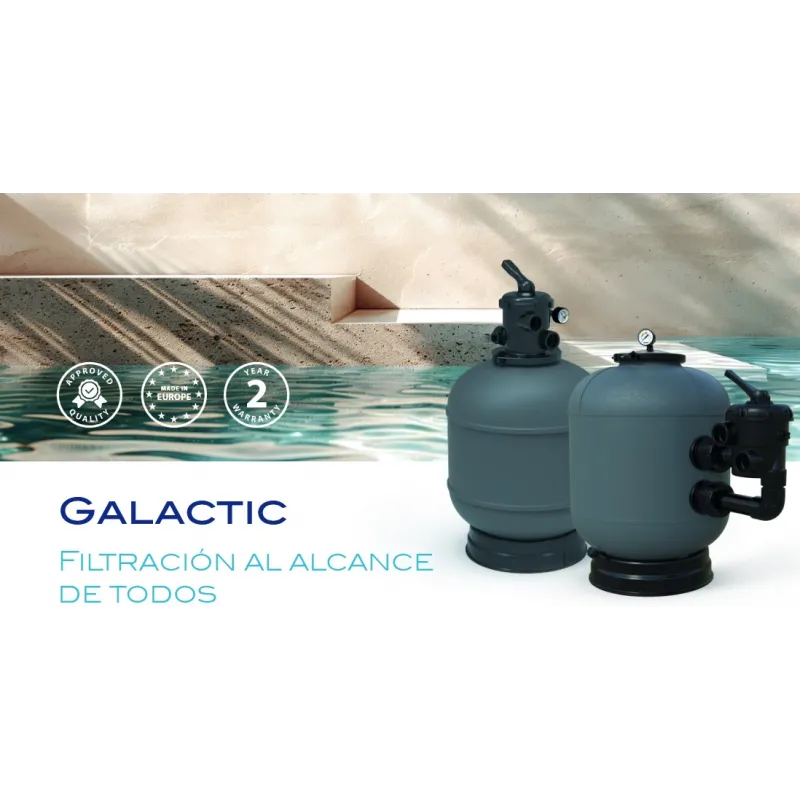 Filtr z tworzywa sztucznego z zaworem wieloportowym. Czarna, wtryskiwana podstawa. Maksymalne ciśnienie robocze: 2,4 Kg/cm2 dla filtrów Ø380 - Ø600 mm. Wszystkie filtry Galactic zawierają zawór boczny lub górny, dostosowując się do wszystkich typów pomieszczeń technicznych. Posiadają również manometr, przezroczysty wziernik i odpowietrzniki, które ułatwiają obsługę i konserwację.