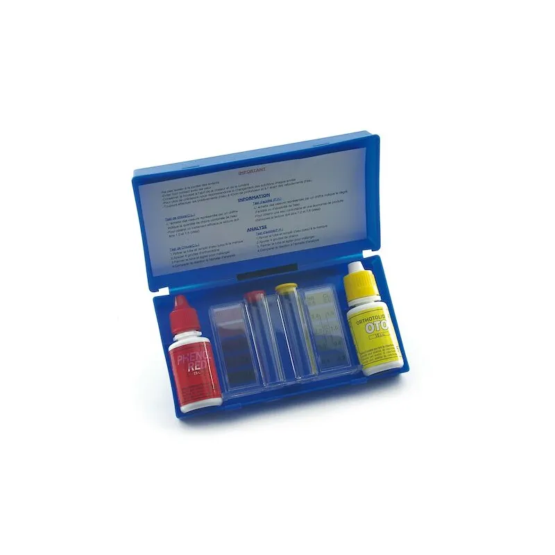Tester do mierzenia zawartości chloru oraz poziomu pH (alkaliczności wody). Tester posiada prostą i czytelną skalę oraz dwie buteleczki z odczynnikami po 15 ml każda.