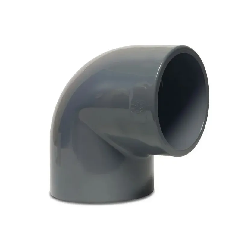 Kolano 90°, Kiwa, wykonane z PVC-U, posiada klejoną mufę, i maksymalne ciśnienie robocze do 16 bar. Złączki te są produkowane zgodnie z EN-ISO 1452-3. Kolano jest dostępny w szerokiej gamie rozmiarów.