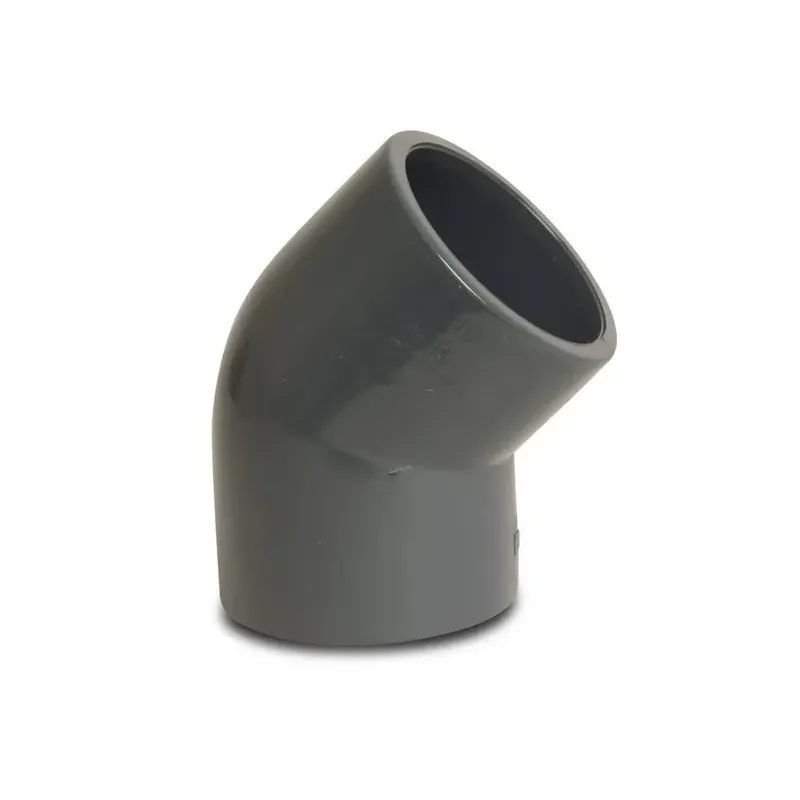Kolano Profec 45°, wykonane z PVC-U, posiada klejoną mufę, i maksymalne ciśnienie robocze 16 bar. Wszystkie klejone złącza są zgodne z EN-ISO 1452-3. Kolana są dostępne w szerokiej gamie rozmiarów.