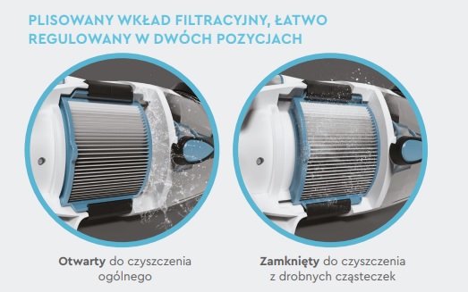 Odkurzacz z dwoma filtrami. Czyszczenie standardowe i czyszczenie z drobnych cząstek w jednym odkurzaczu.Opatentowany system podwójnej filtracji pozwala na dokładne czyszczenie basenu. Odkurzacz posiada filtr ze stali nierdzewnej do większych zanieczyszczeń oraz filtr o drobnych oczkach, plisowany o dużej powierzchni zapewniającą dobrą filtrację. Wyłapuje drobny piasek i osad odkurzony z dna basenu.