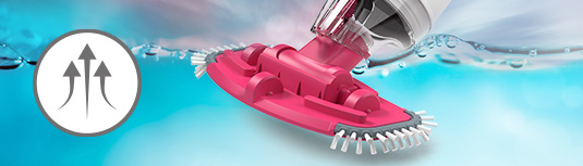 Odkurzacz basenowy ma obrotową głowicę ssącą ze szczotkami bocznymi do czyszczenia narożników i usuwania zaskorupiałych osadów.