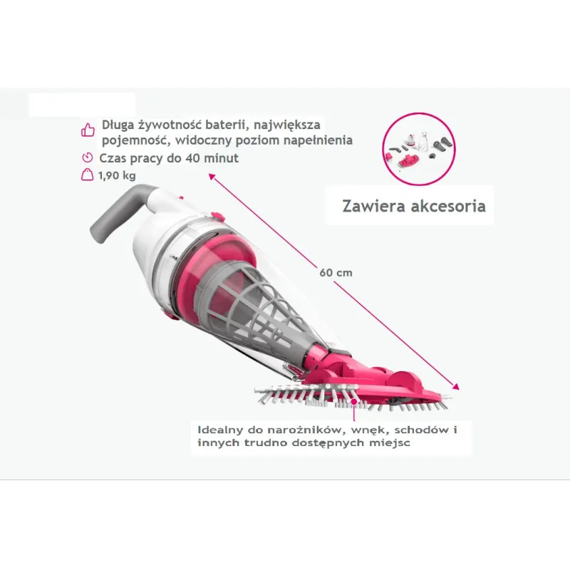 Pomimo swoich rozmiarów, ta miotła składa się z mocnego silnika, który może filtrować 52 litry na minutę.