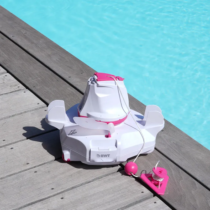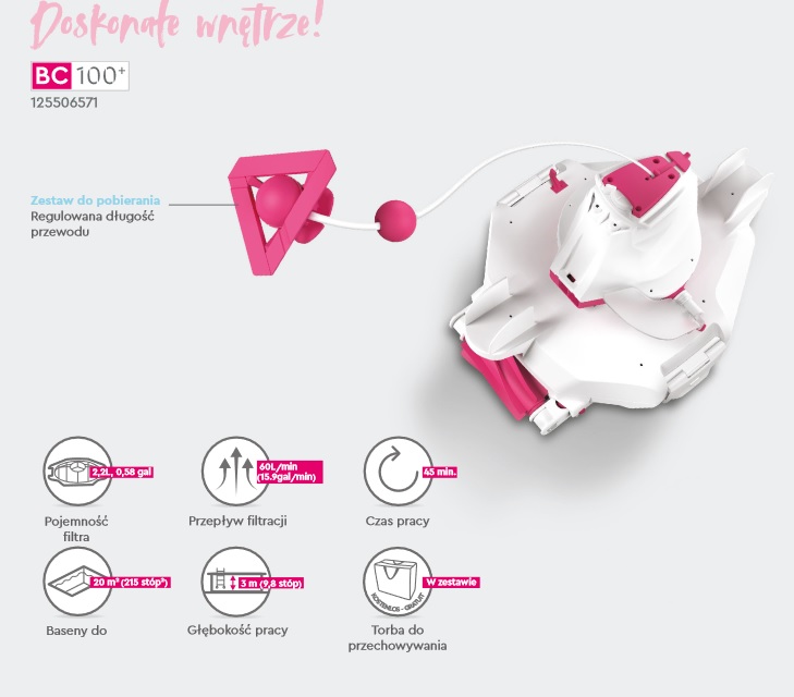 Odkurzacz basenowy BWT BC100+ sprawdzi się idealnie do basenów naziemnych o płaskim dnie, niezależnie od kształtu i wykończenia powierzchni. Wydajny akumulator litowo-jonowy gwarantuje pracę do 45 minut bez utraty mocy ssania po pełnym naładowaniu. Dzięki pojemnej komorze zbierania brudu o wielkości 2.2 litra odkurzacz basenowy może zebrać dużą ilość zanieczyszczeń. Dzięki opatentowanemu systemowi „Stop, Rotate & Go” robot porusza się po dnie basenu bez przerwy i obraca się automatycznie, gdy zetknie się ze ścianą basenu. Kompaktowa i lekka konstrukcja ułatwia wkładanie i wyjmowanie robota z basenu. Odkurzacz basenowy BWT BC100+ posiada również wskaźnik LED, który informuje o niskim poziomie baterii. W zestawie znajduje się także torba do przechowywania urządzenia oraz narzędzie do ściągania.