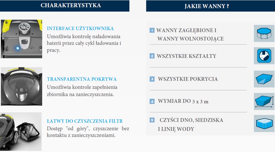 Pierwszy automatyczny odkurzacz do wanien SPA. SPABOT™ jest autonomicznym robotem czyszczącym, zaprojektowanym w technologi bezprzewodowej. Wyposażony w baterię litowo-jonową wielokrotnego ładowania. Kontrolki świetlne wskazują poziom naładowania urządzenia i jego postępujące zużycie w