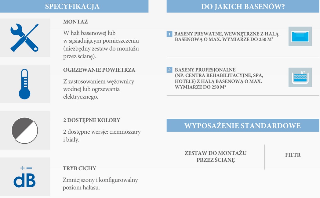 niepotrzebnemu przegrzaniu pomieszczenia. Czujnik wilgotności pozwala na utrzymanie idealnego poziomu nawilżenia powietrza, by chronić elementy wyposażenia basenu i hali przed wilgocią.