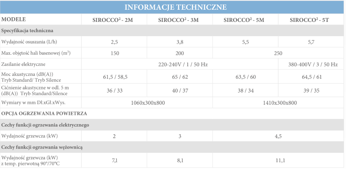 Dzięki możliwości zastosowania wężownicy wodnej lub ogrzewania elektrycznego, Sirocco2 może ogrzewać halę basenową. Elementy grzejne mogą być bezpośrednio wbudowane w osuszacz w czasie jego instalacji, lub później.
