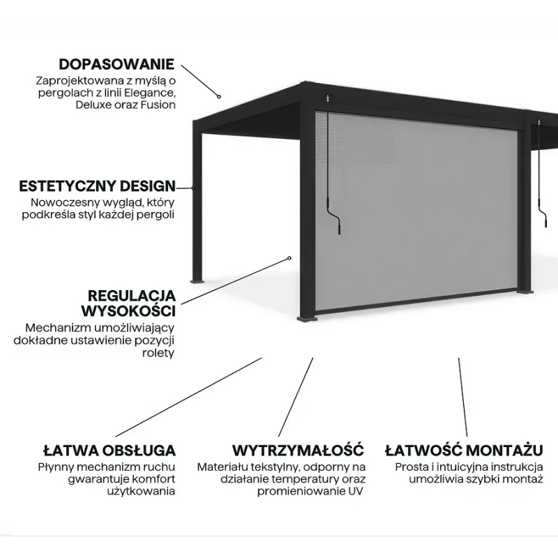 - Możliwość montażu na jednej lub kilku ścianach pergoli