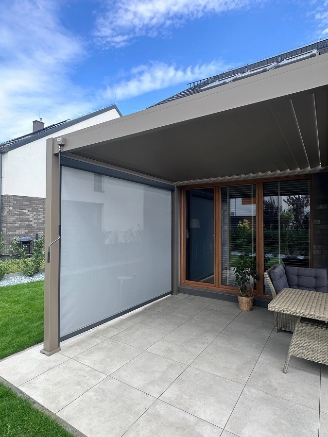 Roleta opuszczona daje możliwość szybkiej zamiany aranżacji pergoli i odgrodzenia się od otoczenia.