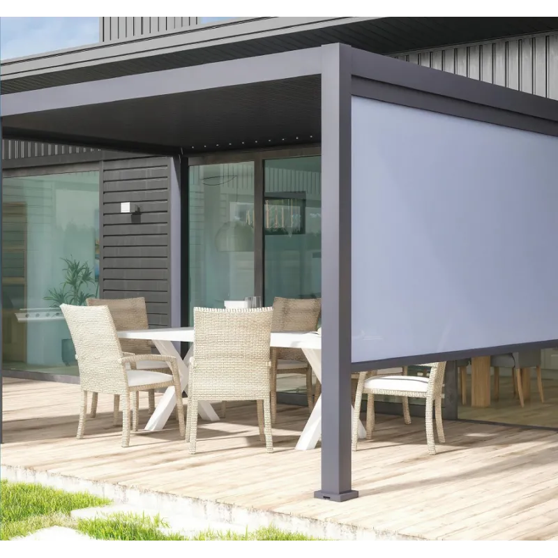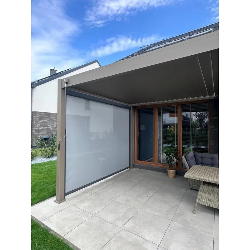 Roleta opuszczona daje możliwość szybkiej zamiany aranżacji pergoli i odgrodzenia się od otoczenia.