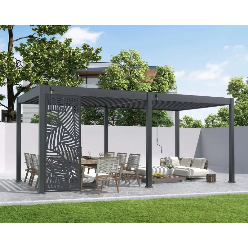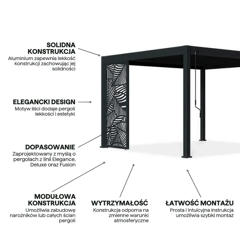 Stwórz komfortową strefę odpoczynku dzięki panelom dekoracyjnym do pergoli. Panele dekoracyjne pozwalają cieszyć się prywatnością bez rezygnacji z eleganckiego wyglądu. Możesz idealnie dopasować potrzebną liczbę paneli aby częściowo lub całkowicie zasłonić boki pergoli. Nowoczesne panele pozwalają na stworzenie unikatowej aranżacji pergoli, a delikatne przenikanie światła przez panel stwarza niepowtarzalny klimat.