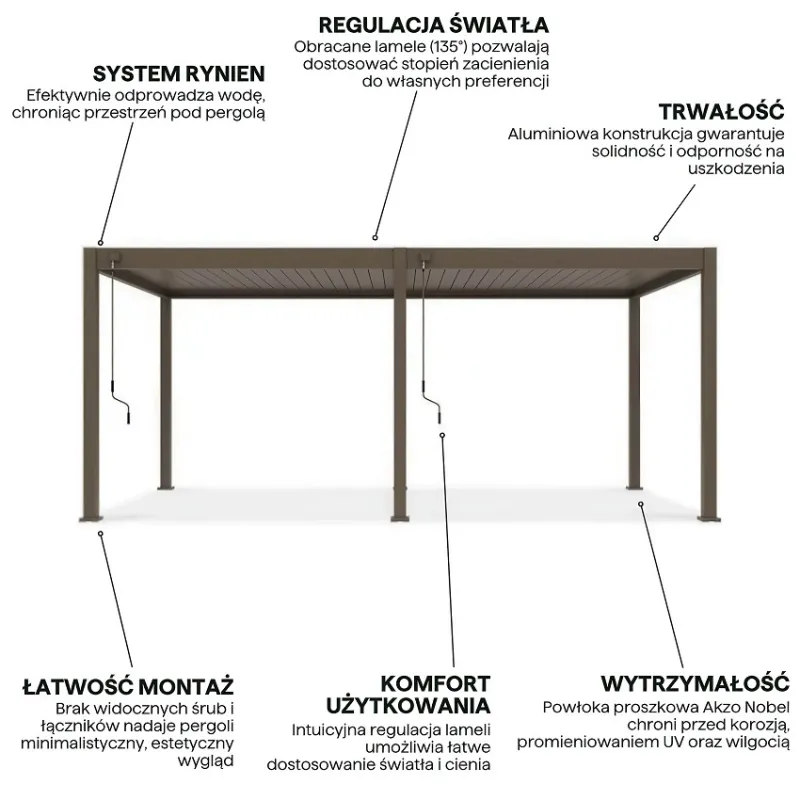 Pergola jest odporna na wiatr do 100 km/h, co zapewnia stabilność nawet podczas silnych wichur. Dach wytrzymuje obciążenie śniegu do 50 kg/m², dzięki czemu sprawdzi się także zimą przy umiarkowanych opadach. Jakość produktu potwierdza certyfikat Intertek, a konstrukcja z aluminium malowanego proszkowo zapewnia odporność na promieniowanie UV i korozję, chroniąc przed blaknięciem i uszkodzeniami.