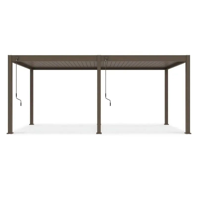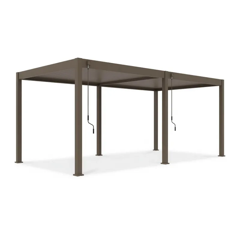 Regulowany dach lamelowy. Innowacyjny dach lamelowy pergoli umożliwia odchylanie listew o 135°, co pozwala precyzyjnie kontrolować ilość światła docierającego do wnętrza. Możesz ustawić lamele tak, aby ochronić się przed intensywnym słońcem lub cieszyć się maksymalnym nasłonecznieniem, w zależności od swoich potrzeb. Listwy dachowe można ustawiać za pomocą korby dowolnie, zgodnie z aktualnymi potrzebami. Chronią one zarówno przed słońcem jak i przed deszczem, który dodatkowo odprowadzany jest po zintegrowanej rynnie. Pergola zaprojektowana została jednak z myślą o zmiennej ochronie przed słońcem i deszczem, dlatego należy pamiętać o możliwym przedostaniu się wody podczas intensywnych opadów. Podczas opadów śniegu natomiast, lamele dachowe powinny być ustawione w pozycji pionowej, co pozwoli uniknąć jego zalegania i ewentualnego uszkodzenia pergoli.
