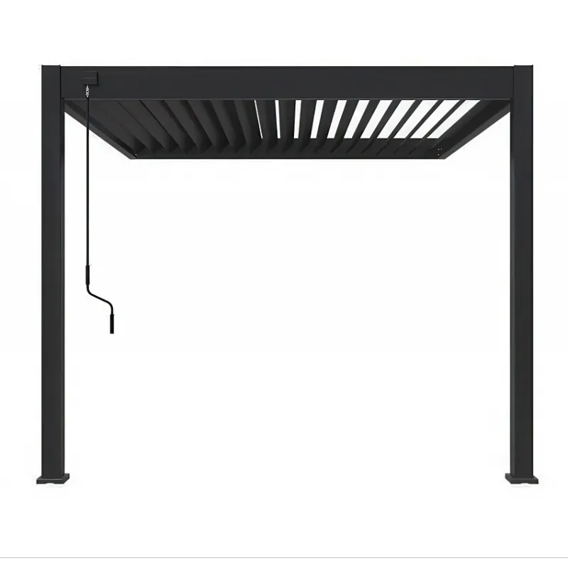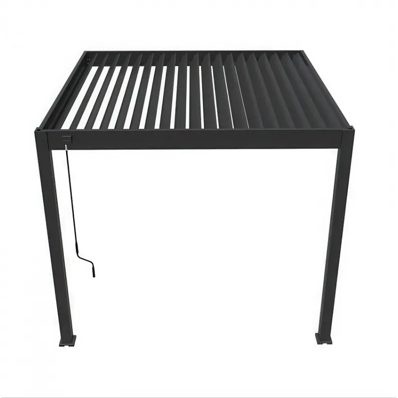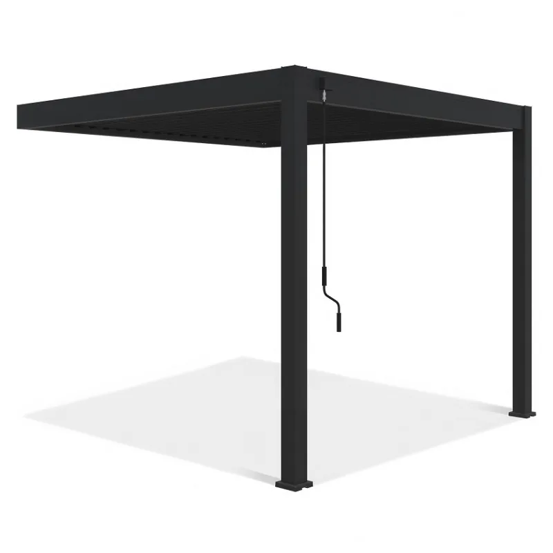 Regulowany dach lamelowy. Innowacyjny dach lamelowy pergoli umożliwia odchylanie listew o 135°, co pozwala precyzyjnie kontrolować ilość światła docierającego do wnętrza. Możesz ustawić lamele tak, aby ochronić się przed intensywnym słońcem lub cieszyć się maksymalnym nasłonecznieniem, w zależności od swoich potrzeb. Listwy dachowe można ustawiać za pomocą korby dowolnie, zgodnie z aktualnymi potrzebami. Chronią one zarówno przed słońcem jak i przed deszczem, który dodatkowo odprowadzany jest po zintegrowanej rynnie. Pergola zaprojektowana została jednak z myślą o zmiennej ochronie przed słońcem i deszczem, dlatego należy pamiętać o możliwym przedostaniu się wody podczas intensywnych opadów. Podczas opadów śniegu natomiast, lamele dachowe powinny być ustawione w pozycji pionowej, co pozwoli uniknąć jego zalegania i ewentualnego uszkodzenia pergoli.