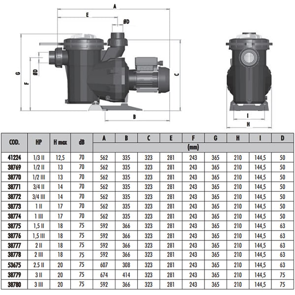 - Dostępny w modelach od 1/2 CV do 3 CV, z silnikami jednofazowymi lub trójfazowymi