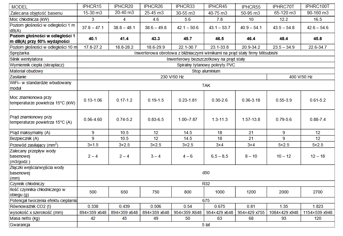 Dobór odpowiedniej pompy ciepła Inverter-Plus IPHCR dokonywany jest na podstawie objętości basenu, zgodnie ze wskazówkami z tabeli „Dane techniczne”.