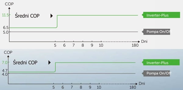 Średni współczynnik efektywności pomp Inverter-Plus wynosi COP = 11,5 (50% wydajność) i COP = 16 (20% wydajność) przy założeniu A260C/W260C/H80%. .