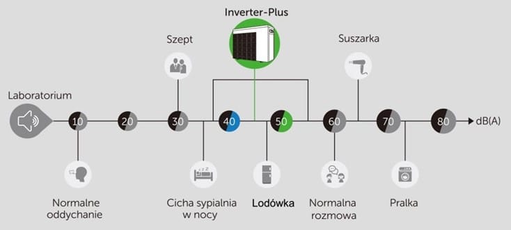 W pompach Inverter-Plus zastosowano ciche sprężarki Mitsubishi oraz inwerterowe wentylatory. Praca urządzenia przy utrzymywaniu zadanej temperatury wody przy wydajności 50%, jest około 10 razy bardziej cicha niż klasycznych pomp ciepła typu On/Off.