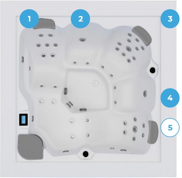 Pozycja 5 - Sześć strumieni skierowanych na podstawę szyi, kregosłup i kompleksy mięśniowe, po jednym na każdą łydkę: Celem masaży klatki piersiowej jest uzyskanie dobrego samopoczucia poprzez złagodzenie nacisku na plecy i szyję powstałego na skutek codziennych napięć, złej postawy lub pewnego osłabienia mięśni. Wraz z relaksującym masażem łydek, w tej pozycji organizm bardziej odpoczywa, co pomaga lepiej spać i eliminować toksyny.