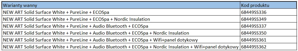 Podana cena wanny dotyczy wersji podstawowej NEW ART + ECOSPA (izolacja). Inne warianty wanny z dodatkowymi udogodnieniami wyceniamy na zapytanie. Poniżej tabela możliwych wariantów.