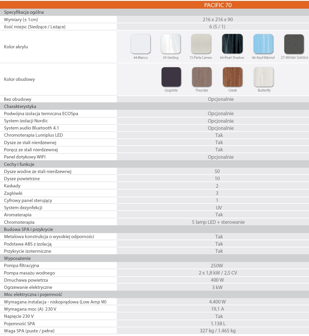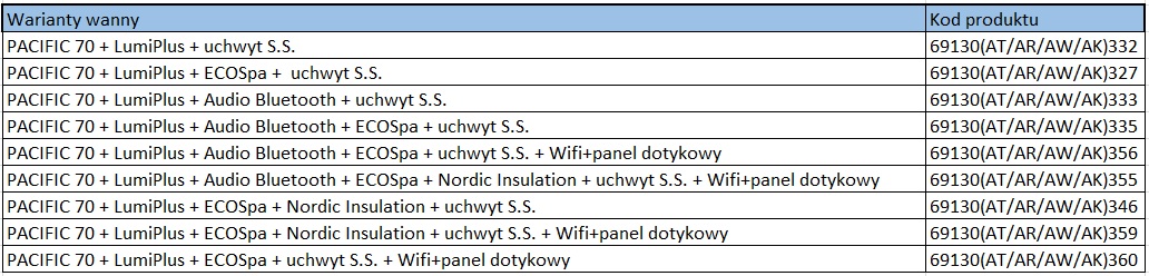 Podana cena wanny dotyczy wersji podstawowej PACIFIC 70 + LUMIPLUS (oświetlenie) + uchwyt SN. Inne warianty wanny z dodatkowymi udogodnieniami wyceniamy na zapytanie. Poniżej tabela możliwych wariantów.