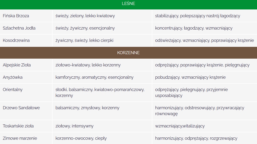 Olejek eteryczny oparty na bazie naturalnych wyciągów roślinnych o intensywnym aromacie. Idealny do sauny i łaźni parowej. Charakteryzuje się bardzo dobrą jakością i wysoką intensywnością zapachową. Wykazują różnorodne działanie prozdrowotne.